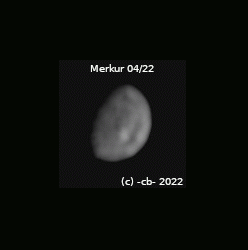 I made several attemtps to capture Mercury during such a morning or evening visibility, hoping for moments of clam air in the usually very bad seeing conditions near the horizon, but that never worked. But then I manged to observe Mercury in daylight during a 4-day long clear sky period in April 2022. The comparison with satellite photos from WinJupos shows, that a 6" optics can resolve real detail, if the conditions allow it. E.g. crater Kuiper appears as prominent white spot in the image. The 4-day animation on the right additionally illustrates Mercurys slow rotation. |